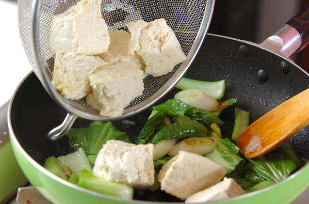 フライパンにサラダ油を入れ強火で白ネギ、チンゲン菜を炒め合わせ、全体に油がまわったら豆腐を加える。ザックリ炒め合わせて<調味料>を加え、全体にからめて器に盛る。