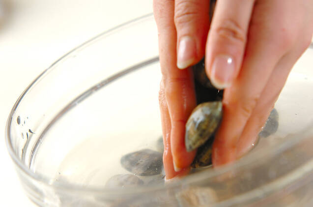 アサリは殻と殻をこすりあわせるように水洗いし、ザルに上げておく。(ヒント)砂出しをしていないアサリの場合は、海水位の塩水を入れたボウルにザルを重ねてアサリを入れ、半日以上つけておいて下さい。アサリから出てきた砂は、網を通してボウルに落ちるので、再びアサリが取り込むことはありません。