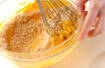 ボウルにカボチャをこし入れ、無塩バター、塩、三温糖、ナツメグ、シナモンパウダーを入れ、泡立て器で混ぜ合わせる。