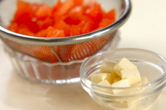 トマトは横半分に切り、種とヘタを取って1cm角に切り、ザルにのせて水気をしっかりきる。クリームチーズは、1cm角に切る。バゲットは幅2cmの輪切りにする。