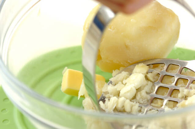ラップで包んだジャガイモは、電子レンジで3~4分加熱し、熱いうちにタオル等で包んで皮をむき、<下味>の材料を加えてマッシャーでつぶす。(ヒント)電子レンジは600Wを使用しています。
