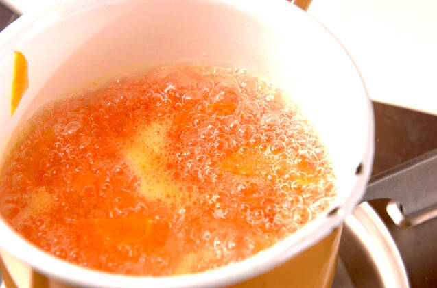 キュウリは両端を切り落とし、縦縞にむいて薄い輪切りにして塩をからめ水気が出たら水気を絞る。ニンジンは皮をむき縦半分に切って薄い半月切りにし、熱湯でサッとゆでてザルに上げる。
