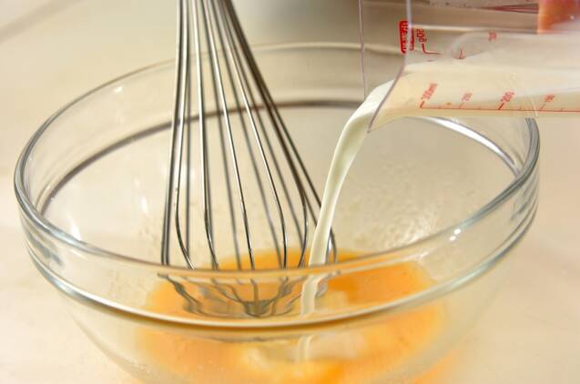 ボウルに卵を入れてほぐし、グラニュー糖を加えて混ぜ合わせ、牛乳も加えて混ぜる。