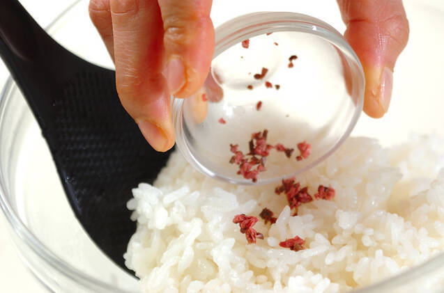 ご飯に桜の花の塩漬けを加え、混ぜる。