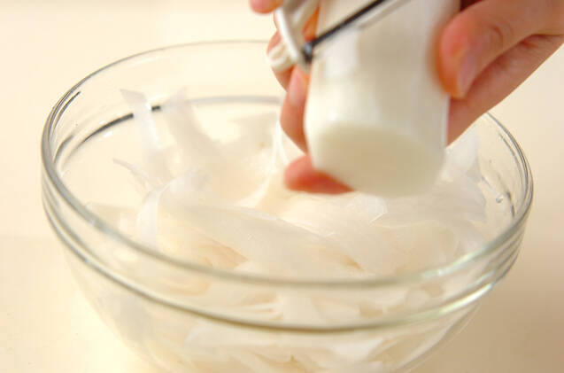 大根は皮をむき、ピーラーで薄切りにする。