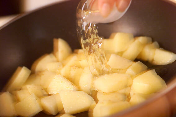 サラダ油大1/2を足し、水切りしたジャガイモを加え、少し焼き色がつくまで炒める。顆粒コンソメ、水を加え、水分がなくなるまで炒め煮にする。