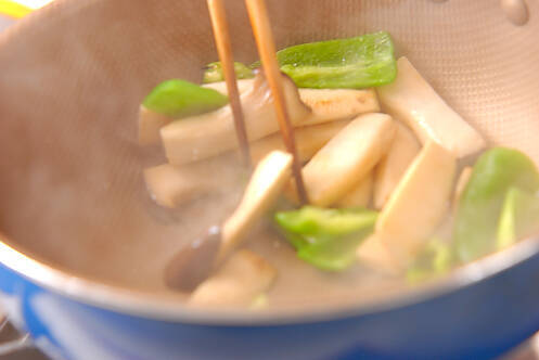 フライパンにゴマ油を熱し、エリンギに焼き色がつくまで焼きピーマンを加えて炒め合わせる。塩コショウを振り、オイスターソースを加えて炒め合わせ器に盛る。