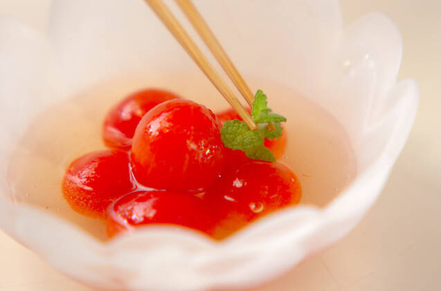 食べる直前に汁と一緒に器に盛り、ミントの葉を添える。