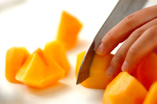 柿は縦4~6つのくし切りにしてヘタを取り、皮をむいて食べやすい大きさに切る。
