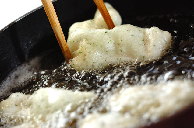 イカは汁気を軽く押さえて片栗粉をまぶし、<衣>をたっぷりつけ、160℃の揚げ油でふっくらと濃い揚げ色がつかないように揚げ、油をきる。