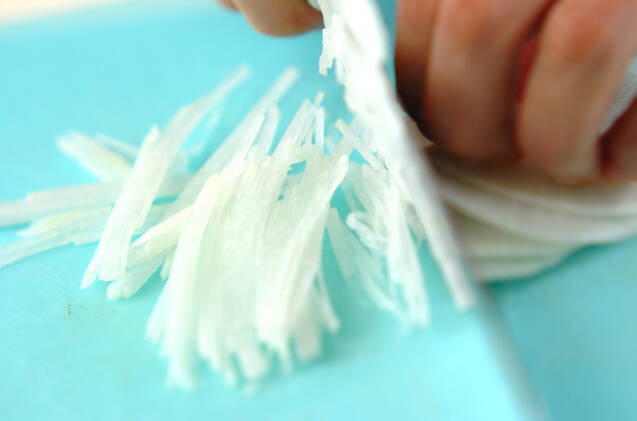 大根は皮をむき、スライサーなどで薄切りにし、さらにせん切りにして冷水に放つ。