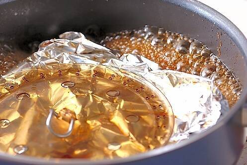 落とし蓋と鍋の蓋をして、煮立ったら火を少し弱め12~15分煮る。火をいったん止めて10分置き、味を含ませる。