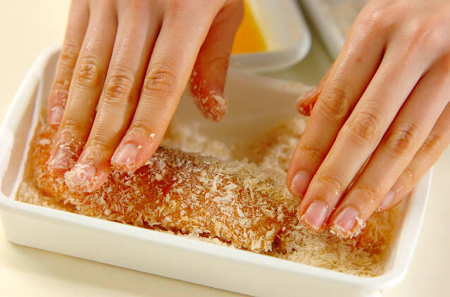 鮭は塩コショウを振り、<衣>の小麦粉、溶き卵、パン粉を順につける。