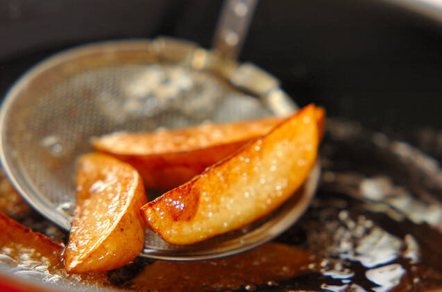 フライパンにジャガイモ、ヒタヒタ量のサラダ油を入れて中火にかける。薄いキツネ色になり、竹串がスッと刺さるようになったら取り出し、油をきる。熱いうちに塩コショウを振る。