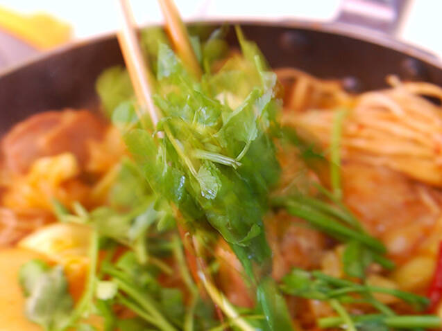全体に油がまわったらエノキ、キャベツ、白菜キムチを炒めて<調味料>を加える。煮立ったら弱めの中火にし、鶏肉に火が通るまで煮て春雨を加え4~5分煮る。セリを加えてセリがしんなりしたら火を止め、器に盛って、3の卵焼きを散らせる。※赤唐辛子はお好みで加減して下さい。