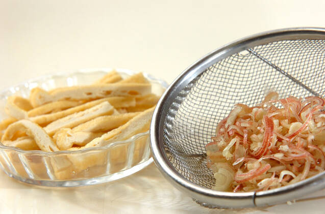 ミョウガは縦半分に切り、薄い半月切りにして水に放ち、水気を絞る。