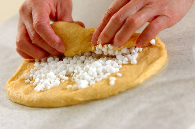 ひとまとまりになったら、無塩バターを加え、生地を台の上に出してこねる。8割ほどこねたら生地を広げてワッフルシュガーを混ぜ込む。温かいところに置いて約2倍に膨らむまで待つ(30~40分)。