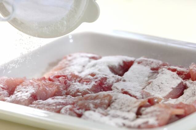 サバの水気をキッチンペーパーで押さえ、片栗粉をからめ、170℃の揚げ油でサクッと揚げて油をきる。