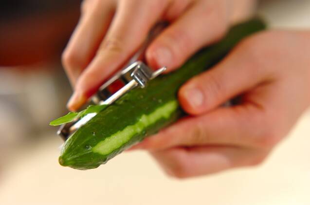 <キュウリのオニオンサラダ>の下準備をする。玉ネギは、みじん切りにする。キュウリは、3本縦に皮をむいて小口に切る。