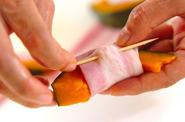 (2)をベーコンでしっかりと巻き、つま楊枝で留める。