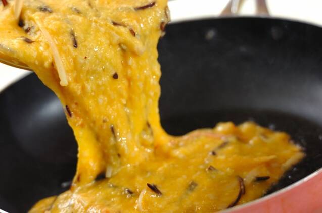フライパンにゴマ油を半量入れて強火にかけ、(3)の半量を流し入れる。手早く混ぜて半熟状になったら中火にし、形を整えて焼く。