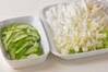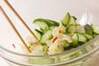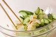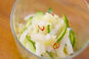 たっぷりの熱湯に塩を入れ白菜をさっとゆで、ザルに上げ冷めれば水気を切って、キュウリと<合わせ甘酢>と合わせる。