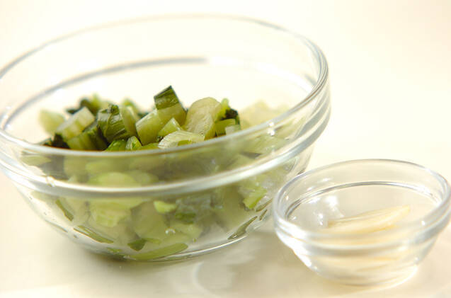 アサリは殻と殻をこすり合わせるように水洗いし、ザルに上げておく。野沢菜は軽く水洗いし、水気を絞って粗く刻む。ニンニクは芽を取り除き、薄切りにする。