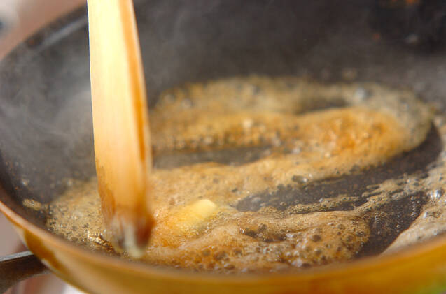 小鍋に<カラメル>のグラニュー糖、水を入れて中火にかけ、キツネ色になればバターを加えて火を止める。