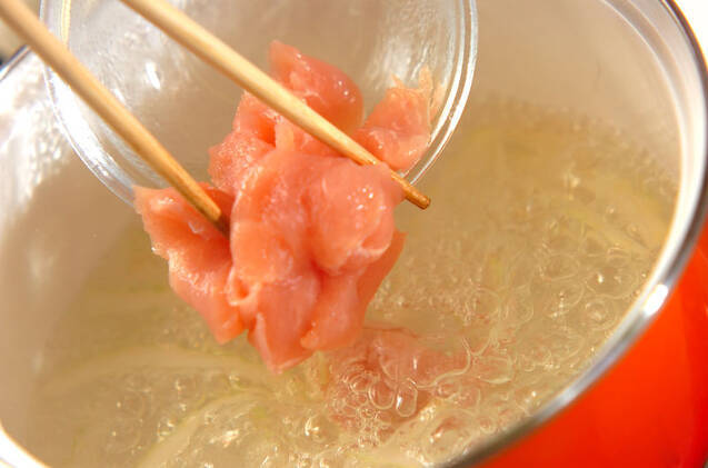 水を鍋に入れて沸かし、鶏ガラスープの素、セロリ、鶏ささ身を入れて、煮たったら、酒、ナンプラーを入れる。