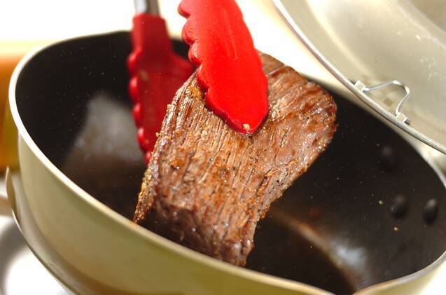 フライパンにオリーブ油を熱し、牛もも肉を入れ、中火で全体に焼き色が付くまで焼く。蓋をして弱火で、時々裏返しながら3分蒸し焼きにする。