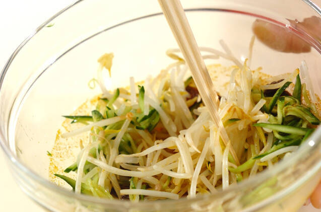 たっぷりの熱湯にモヤシを加えてゆで、ザルに上げてゆで汁をきる。キュウリと共に<カレー酢>のボウルに加えて和え、器に盛る。