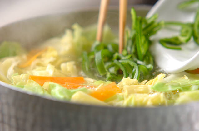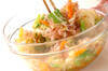 塩を入れた熱湯にキャベツ、ニンジンを入れ火が通ったらピーマンを加えてひと混ぜし、ザルに上げる。