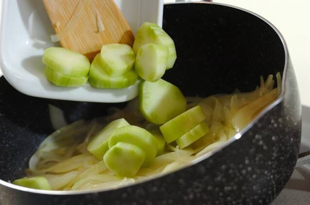鍋にバターを入れて中火にかけ、溶けだしたら玉ネギを加え、炒める。油が回ったらブロッコリーの茎を入れ、分量外の塩少々を振り、炒める。
