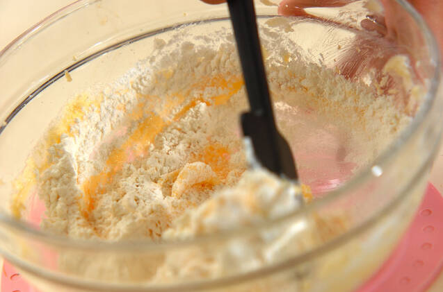アーモンドパウダーを加えて切り混ぜ、薄力粉とベーキングパウダーを加えて粉気がなくなるまで混ぜる。