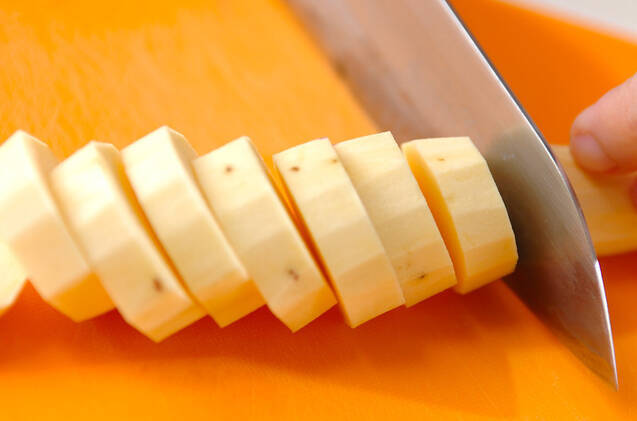 サツマイモは皮をむき、厚さ1cmの輪切りにして水に放ち、白濁したらザルに上げて水気をきる。玉ネギは縦薄切りにする。