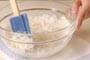 <中種>を作る。ボウルに牛乳、ドライイースト、強力粉、薄力粉を入れてゴムべらで混ぜ合わせ、30分発酵させる。