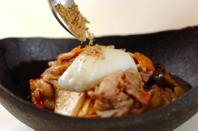 ラップをはずして軽く混ぜ合わせる。器に盛って温泉卵をのせ、すり白ゴマを振る。