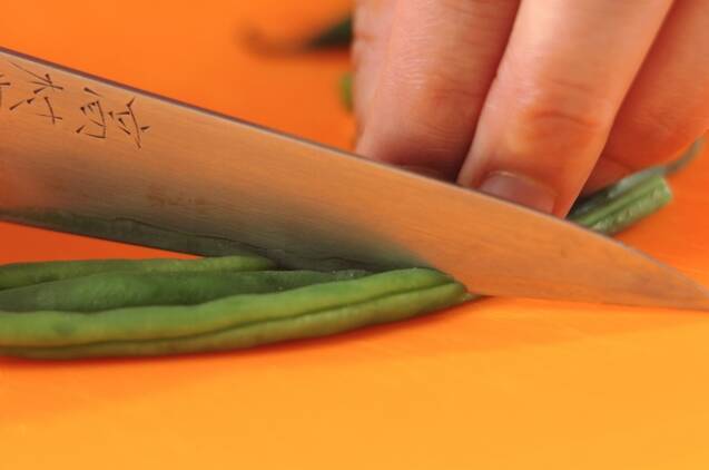 サヤインゲンは軸側を少し切り落とし、分量外の塩を入れた熱湯で1~2分ゆで、ザルに上げてしっかり水気をきる。 長さを半分に斜め切りにする。