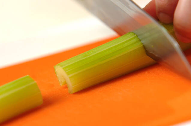 セロリは根元を切り、太い部分は縦半分にしてから長さ6~7cmに切る。