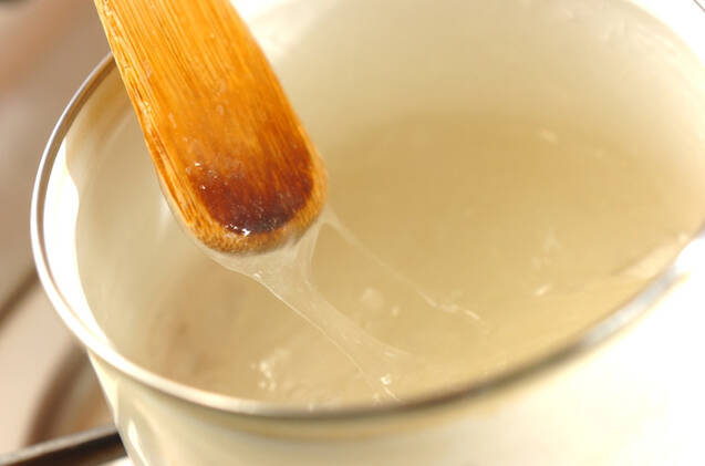 水に溶かした葛を加え、弱火にかけ木ベラで混ぜながら、透明感が出てトロミがつくまで火を入れる。