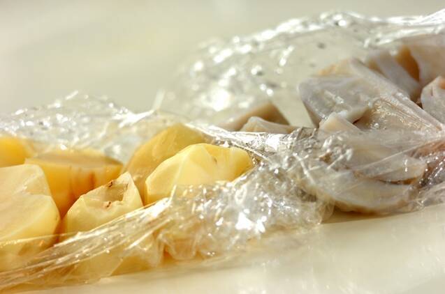 ジャガイモ、レンコンは皮をむき、ひとくち大に切る。サッと水に通し、それぞれぬれたままラップで包み、電子レンジで3~4分加熱する。プチトマトはヘタを取る。