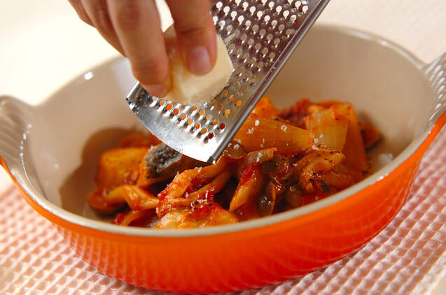 塩、粗びき黒コショウで味を調えて器に盛り、あればパルメザンチーズを削りながら振る。(ヒント)塊のパルメザンチーズがない場合は、粉チーズでもOKです。