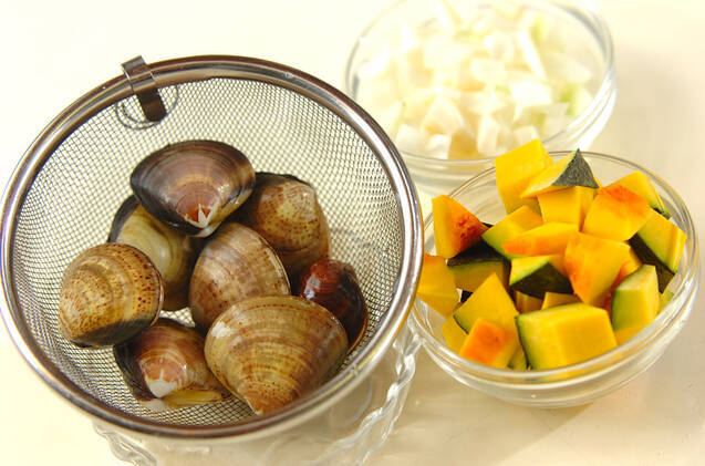 ハマグリは分量外の薄い塩水につけて砂出しをし、殻と殻をこすり合わせて洗い、ザルに上げる。