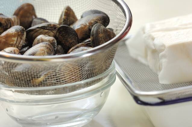 アサリは殻と殻をこすり合わせるようにして水洗いし、ザルに上げる。絹ごし豆腐はザルに上げて水気をきる。<調味料>の材料を混ぜ合わせる。