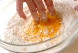 卵、オリーブ油を混ぜ合わせ、固さの調整用に少し残しておき、凹みに入れる。まわりから粉を崩しながら少しずつ混ぜる。