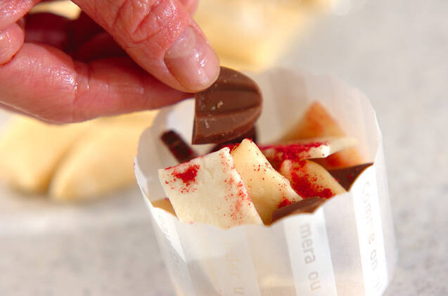 カップに、4等分しておいたパン生地、パイシート、チョコレート、フランボワーズを交互になる様に入れていく。