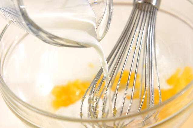 <レンジカスタード>を作る。 耐熱ボウルに卵黄、グラニュー糖を加えて泡立て器でよく混ぜ合わせ、牛乳、薄力粉を加えて更にしっかり混ぜ合わせる。