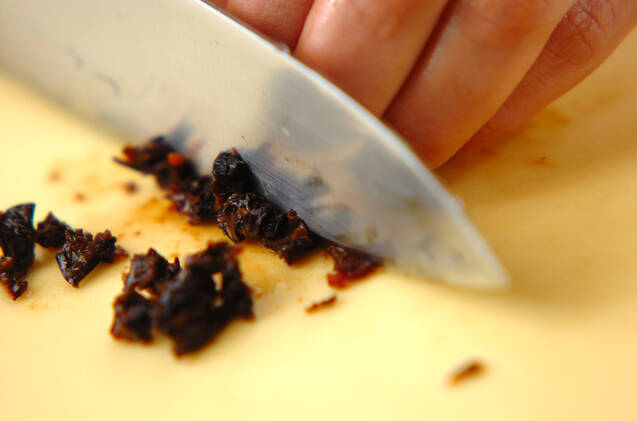 ドライトマトはぬるま湯でもどし、粗みじん切りにする。
