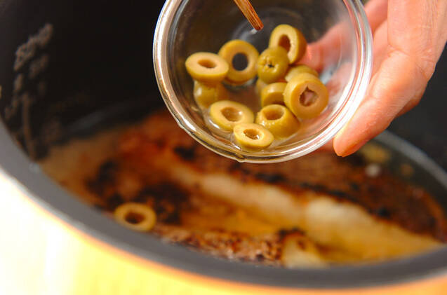 炊飯器に洗ったお米、<調味料>の材料を加え、通常に炊く時の水量まで分量外の水を加える。焼いた(1)の鯛、ドライトマト、グリーンオリーブをのせ、スイッチを入れて普通に炊く。