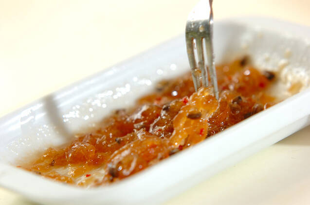 鍋にドレッシングを入れ、沸騰直前まで温めて火を止める。ふやかしたゼラチンを加えて余熱で溶かし、バットに流し入れて冷蔵庫で冷やしかためる。かたまったらフォークで崩す。